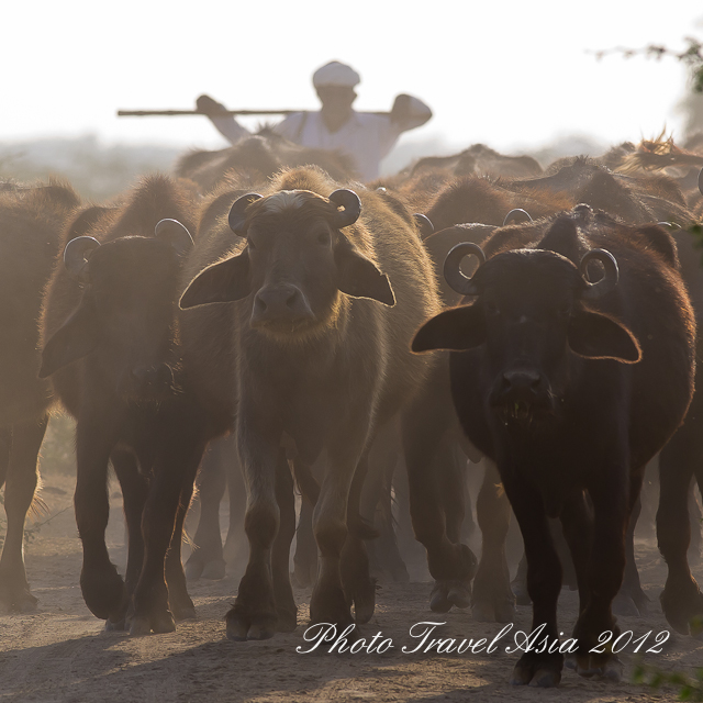 After lunch, we rode an open jeep to a nearby lake (just 20 mins away) to see the water birds. On that cool but also sunny afternoon, we were greeted by children waving and saying ‘hello, hello, hello’ while passing through the small villages. As we approached the lake, a herd of buffalos headed slowly toward us, stirring up the dust below. In the midst of the sun and the dust, a faint silhouette of a Rabari men dressed in white emerged behind the buffalos holding his staff. We turned our attention from the flamingoes in the lake to capture the magical moment of the tribe and buffalos. Rabari men were usually recognizable in their all white apparel, donning heavy earrings (toliya).