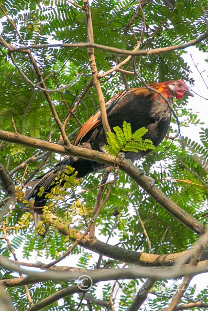 A pair of Red Junglefowl (Gallus gallus) were feeding on the grass patch near the MRT station near Orchard Road. They flew-up to a nearby tree as I approached them with my phone camera. As usual, I ran back and picked up my DSLR camera. Surprisingly, they were quite comfortable on top of the tree. While I was hoping for them to come down to the ground again to get a better view. They stayed on the tree . Has anyone seen Red Junglefowl near Orchard Road, Singapore?