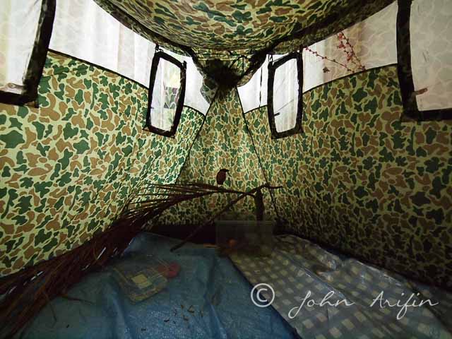 I used a camera hide to make an “aviary” so that the pitta could fly freely. Did you see the swimming pool ? Pitta is at the centre.