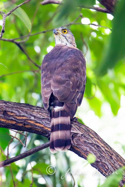 Thanks to Alan OwYong who helped to identify the bird as I was not sure whether it could be the Eurasian Sparrowhawk or Chinese Goshawk. Alan mentioned that the bars on the tail gave the clue away. Alan told me that he had been looking for this bird at the Singapore Botanic Gardens and the Japanese Gardens. Well, one Crested Goshawk was in Orchard area, Singapore. Happy birding.