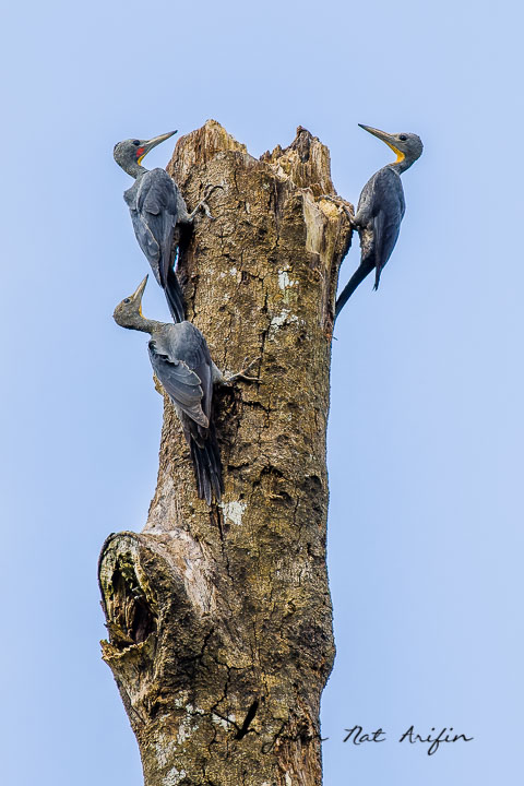 On our way back, we stopped at the dead tree again, hoping the woodpeckers would return. To our delight, we did not see two birds but three. We think the third bird was a chick that emerged from the nest hole on the dead tree. The three birds climbed up to the top of the trunk and posed for us before taking off. That was the highlight of the day.
