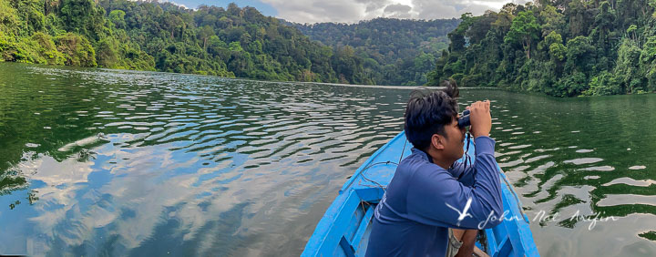 After breakfast, a 4-hour van ride from Hala Bala Wildlife Reserve took us to Bang Lang National Park in southern Thailand through a hilly and winding country road to reach Kampong Chulanporn 9. When we got to the destination, it was time for lunch. We had delicious noodles by the roadside stall overlooking the reservoir with the hilly forest as a backdrop. While having lunch, a white-bellied sea eagle flew above the water to hunt for food. In the afternoon, we hired an eight-seater single-engine wooden canoe to go around the reservoir to search for hornbills. We saw hornbills and White-bellied sea eagles flying high above us. It was not easy to photograph them from the narrow canoe. This was our first birding trip to southern Thailand.