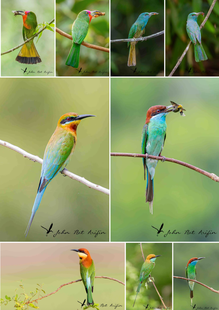 Bee-eaters are aerial birds found in secondary forests, old plantations, parklands, and urban gardens. Small groups are often perched on the trees very high, making them more difficult to photograph. It was a real treat to see them on the ground on a low perch in Sugai Balang padi field, Johor Baru, Malaysia, a few hours’ drive from Singapore.