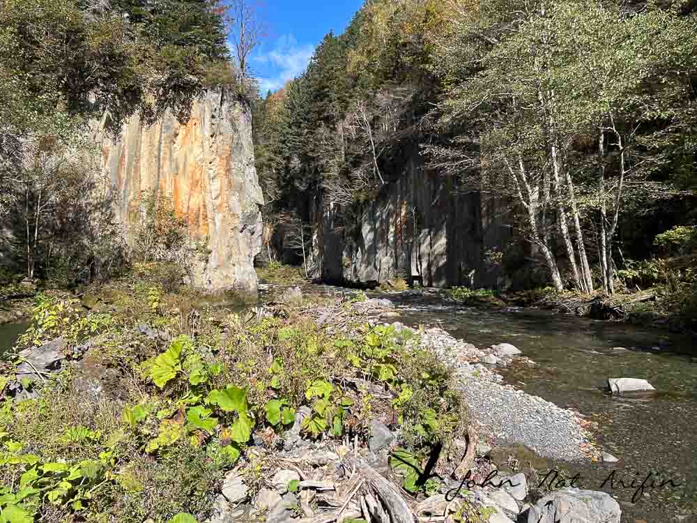Morning mist still clung to the valley when we left Sounkyo, the air cool and thin, carrying the faint scent of cedar. Our first stop was Obako Gorge, where the cliffs rose steep and solemn, their volcanic faces streaked with age. The Ishikari River wound quietly below, its waters flashing silver in the sun. We lingered there for a while—just long enough to feel the pulse of the landscape—before continuing our ascent toward the highlands.