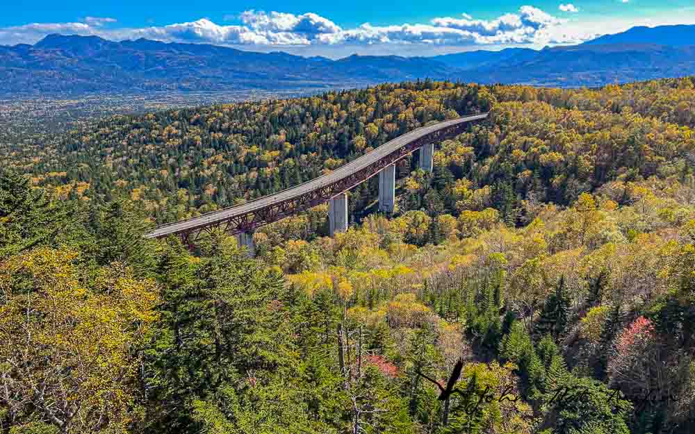 When we reached the Mikuni Bridge, the world opened wide before us. Below lay the vast sprawl of Daisetsuzan National Park, a sea of peaks and valleys drenched in autumn fire. The air was cold and perfectly clear. We stood there for a long time, the wind tugging at our sleeves, as if urging us to remember this view—not just with the camera, but with the heart.