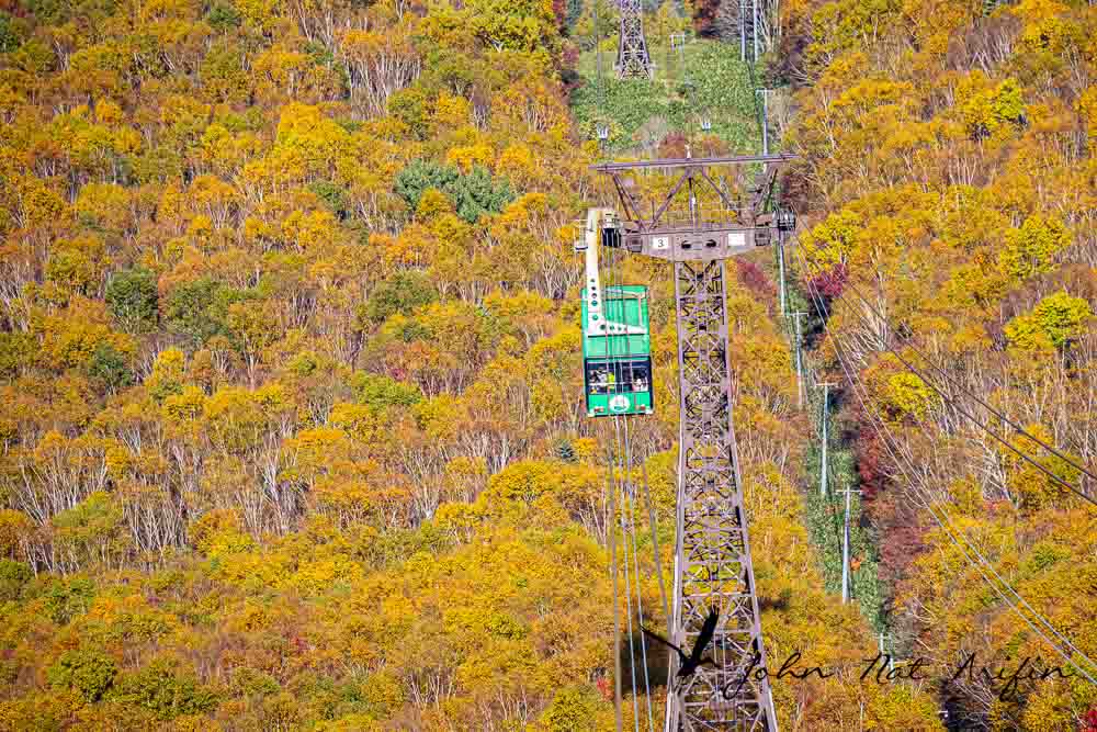 We took the Mount Kurodake ropeway, rising above a flaming carpet of leaves that shimmered like fire under the morning sun. The gondola floated silently through a sea of color, and from above, the mountains looked like a living quilt — stitched with red, amber, yellow and green.